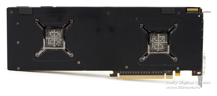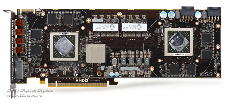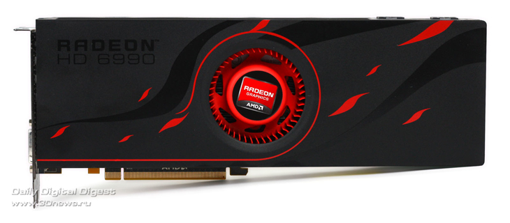 | Сегодня компания Advanced Micro Devices (AMD), как и ожидалось, официально объявила о выпуске нового двухчипового лидера среди своих дискретных графических адаптеров для настольных компьютерных систем, а именно модели AMD Radeon HD 6990, известной также под кодовым названием Antilles. Данный флагман позиционируется разработчиками как наиболее привлекательное для энтузиастов-оверклокеров и заядлых геймеров решение с двумя GPU, теоретическая производительность которого достигает 5,4 триллиона операций с плавающей запятой в секунду. Видеокарта изготовлена на чёрной печатной плате с шиной PCI Express 2.1 x16 и построена на паре созданных по 40-нм технологии чипов с площадью кристалла 389 мм2 (каждый состоит из 2,64 млрд транзисторов). Таким образом, в арсенале есть 3072 потоковых процессора, 192 текстурных модуля (TMU) и 64 блока растеризации (ROP). Новинка укомплектована памятью GDDR5 объёмом 4 Гбайт с 256-битным интерфейсом, полосой пропускания 320 Гбайт/с и частотой 1250 МГц. Кроме того, на борту присутствуют сразу две микросхемы BIOS и особый переключатель, который позволяет выбирать один из двух возможных режимов работы ускорителя. Так, в позиции номер 2 (заводская установка) графическое ядро функционирует на частоте 830 МГц, а напряжение, подаваемое на GPU, равно 1,12 В. Зато для любителей разгона предусмотрена позиция номер 1, при которой частота графического ядра повышается до 880 МГц, а подаваемое на GPU напряжение увеличивается до 1,175 В. Стоит отметить, что организация дополнительного питания у AMD Radeon HD 6990 осуществляется силами двух специальных 8-контактных разъёмов. При этом максимальная потребляемая мощность видеокарты в OC-режиме (переключатель в позиции номер 1) составляет 450 Вт, тогда как в холостом режиме этот показатель не превышает 37 Вт (для разумного управления энергопотреблением применена прогрессивная технология AMD PowerTune Technology). Внимания заслуживает и тот факт, что понижением температуры основных «горячих точек» дебютанта занимается накрытая сверху пластиковым кожухом двухслотовая система активного воздушного охлаждения. Она конструктивно состоит из дуэта прямоугольных алюминиевых радиаторов, каждый из которых в основании имеет испарительную камеру, и расположенного между ними вентилятора. Если же говорить о наборе выведенных на заднюю панель портов, то он представлен одним DL-DVI и четырьмя Mini DisplayPort 1.2. С целью дополнительного расширения коммуникационных возможностей в комплект поставки включены три переходника, а именно Mini DisplayPort to SL-DVI Passive, Mini DisplayPort to SL-DVI Active и Mini DisplayPort to HDMI Passive. Примечательно и то, что графический адаптер совместим с DirectX 11 Shader Model 5.0, снабжён усовершенствованным встроенным видеопроцессором третьего поколения UVD 3, поддерживает технологии AMD Eyefinity Multi-display Technology и AMD CrossFireX Multi-GPU Technology, а также полностью отвечает всем требованиям платформы Windows 7.